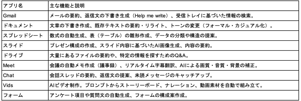 Geminiと連携できるアプリの一覧を作成しました。アプリのサイドバーなどで利用できます。